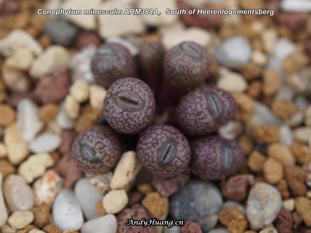 中文名:小M 种:番杏(Mesembs) 属:肉锥(conophytum) 拉丁名:Conophytum minusculm ARM388A,South of Heerenlogementsberg 产地:South of Heerenlogementsberg 销售编号:ARM388A 拍摄时间:2026年1月